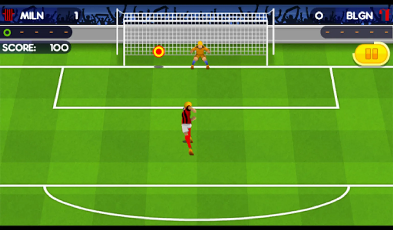 In order to shoot, click anywhere to determine direction, height and strength of the shot. With combination of these, you can perform powerful kicks, but also gentle lob shots. In the role of goalkeeper, watch out for the target which will appear on your goal just before the opponent's kick, and tap on it.