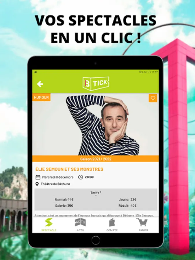 Connoisseur, simple amateur, unconditional fan of the theater, B-Tick allows you to discover the latest shows, the news of our rooms and to reserve your seats in one click!