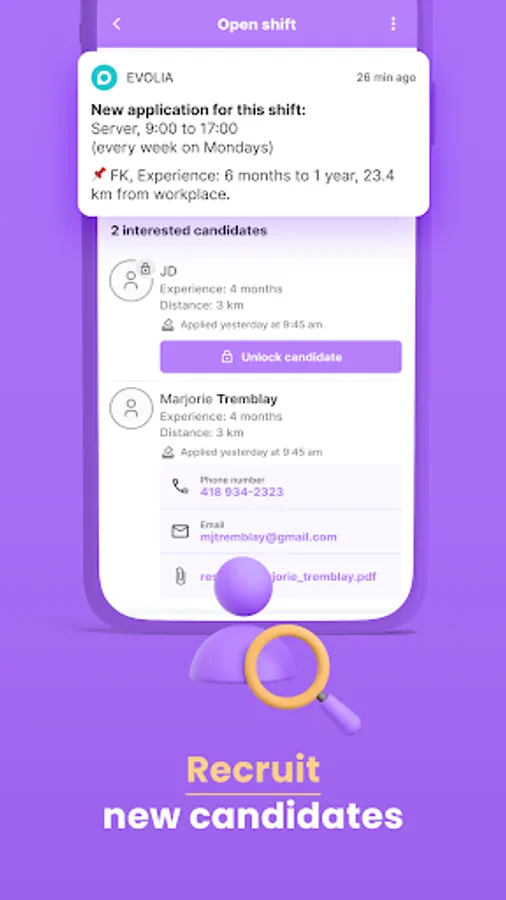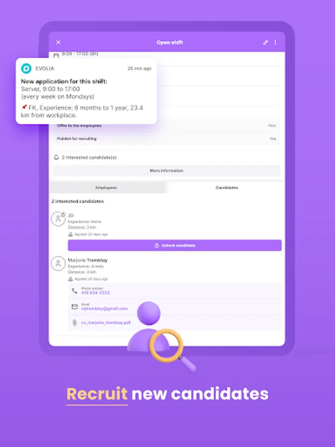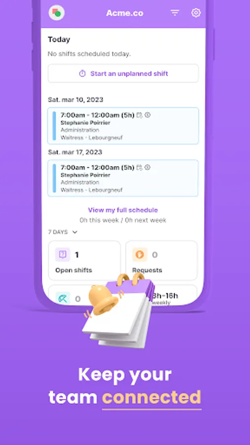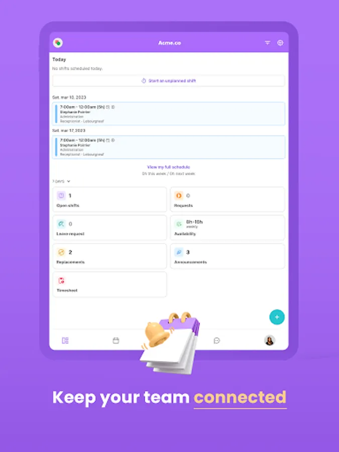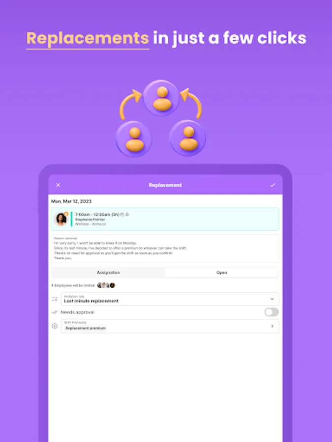 β Fill open work shifts faster by alerting employees through email, SMS or push notifications.