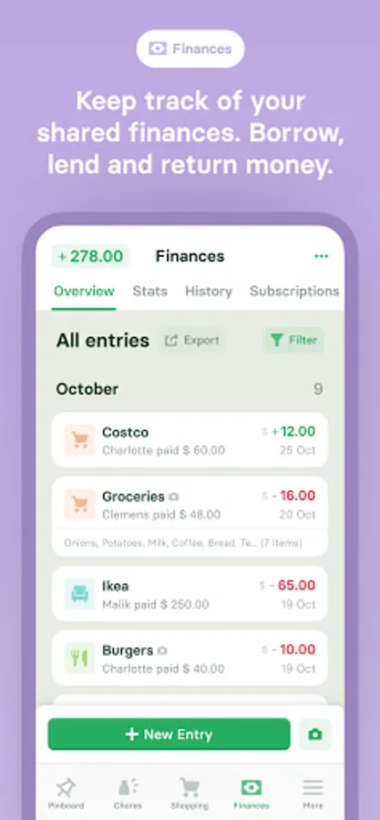 Making tallying up expenses less awkward, adding items to a list can be done in a click. Keep track of who has paid for what – all viewable in a monthly report.