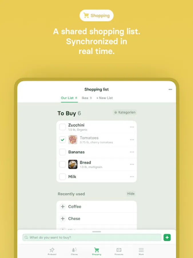 The shopping list is the perfect complement for the expenses. On the way home pick up all the groceries your shared flat needs. With the synchronized shopping list you can see what is needed and when. As soon as you have purchased something in the supermarket, your roommates are even getting notified.