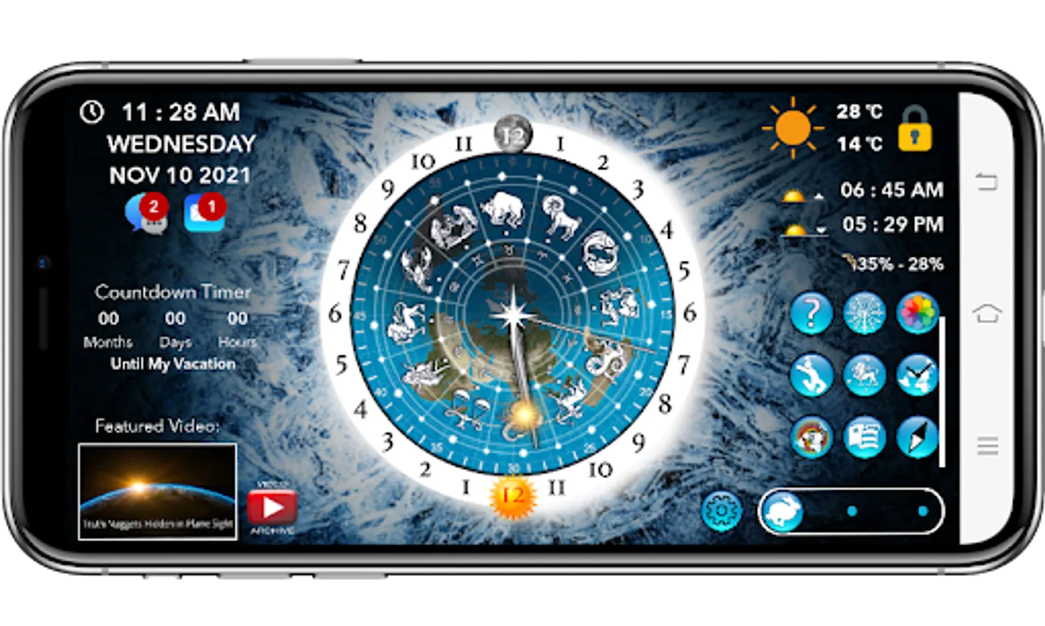 -->Featured Video of the Day: New videos will be featured on the clock face that will help you learn more about the sky clock. Push notifications are available if desired. Video archive button for all past videos.