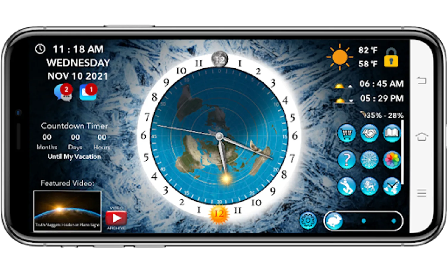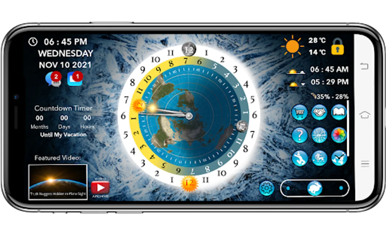 The Flat Earth Sun & Moon Clock shows where the sun and moon are across the face of the earth as shown on the AE map. See where your day & night are, position and phase of the moon as the sun laps it every 28 days. .Track the seasons as the sun travels between the Tropic of Capricorn and the Tropic of Cancer. Subscription is required for sending and receiving messages,making outgoing voice & video calls,new user notification, accessing user profiles,detailed weather service and all future additional features. Yearly subscription is just $10.99 or use 11 or your Referral Points to unlock the subscription for a full year!