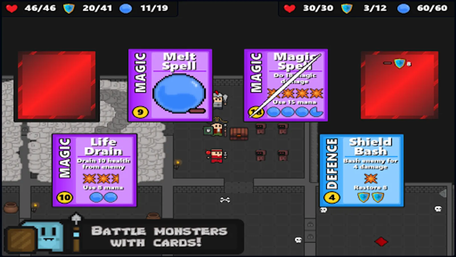 Play your cards right to beat monsters who also each have their own unique cards to play against you with different effects and abilities. Mix and match 40+ of your own unique cards that you can collect along the journey to find the best mix of tactics for winning battles.