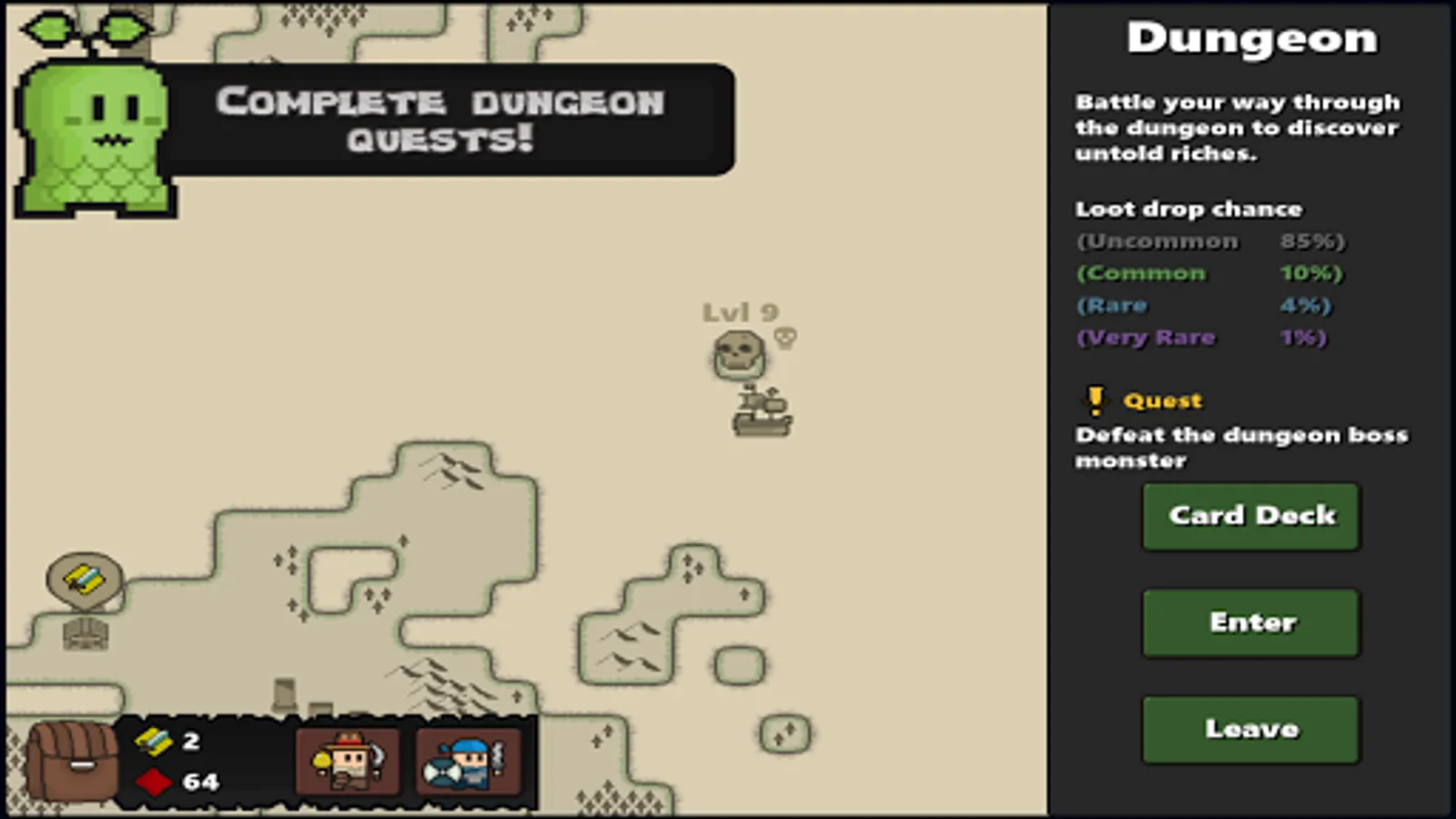 Complete quests to progress through the game to unlock new dungeon levels with greater challenges, stronger monsters and rarer treasure!