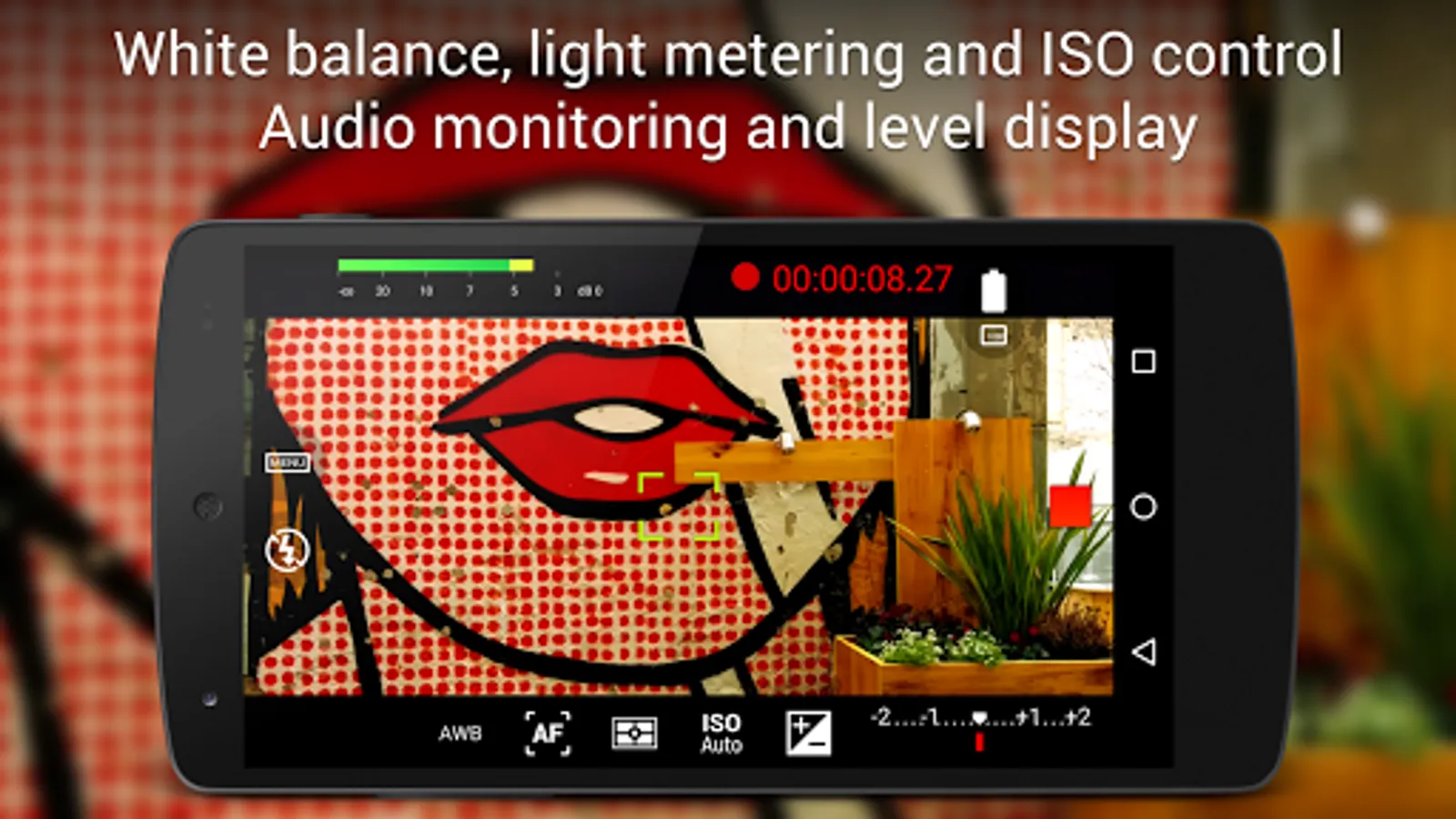● Adjust all the image sensor parameters that you only thought pro-videocameras had: exposure compensation, ISO, light metering mode (matrix/center/spot), focus mode and white balance.