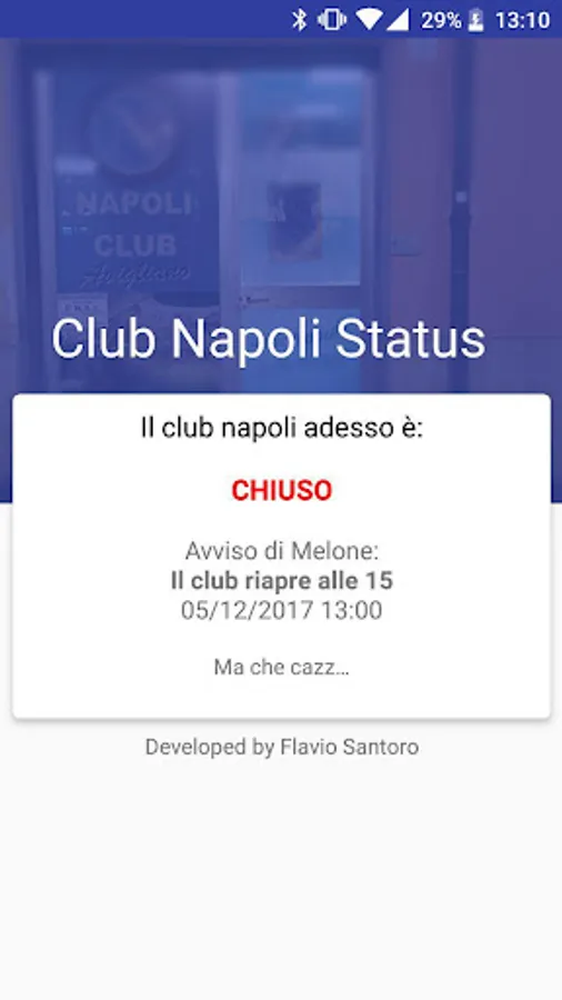 The Club of Naples Avigliano, the famous meeting place and ribuscio, is subject to opening hours rather variable. Instead of asking your friends "but Melone is open?" just open this app to get the answer!