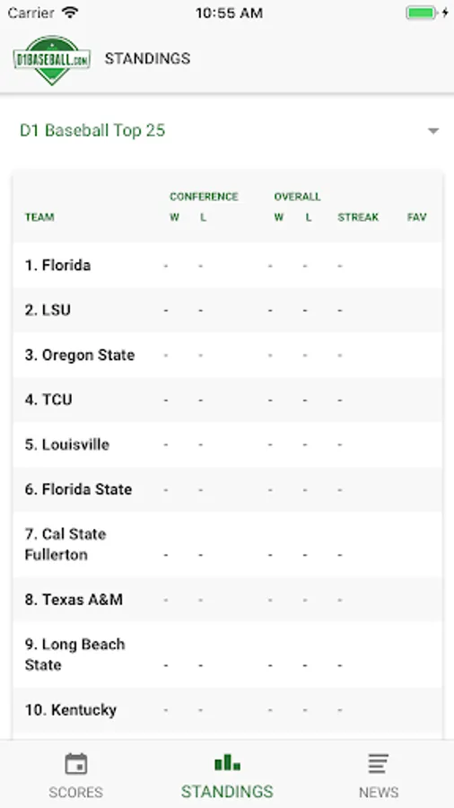 This subscription enables use of the D1 Baseball app which provides up-to-date scores, standings, and schedules for Division I College Baseball. Once subscribed, you will be able to view information about your favorite Division I College Baseball teams. While viewing team standings, by conference, you can select teams as favorites. Games for your favorite teams will show up first in the scores view. You can also receive alerts, in the form of push notifications, for selected teams.