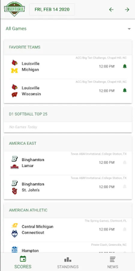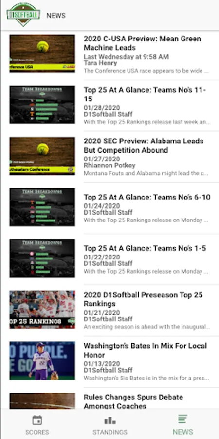 This subscription enables use of the D1 Softball app which provides up-to-date scores, standings, and schedules for Division I College Softball. Once subscribed, you will be able to view information about your favorite Division I College Softball teams. While viewing team standings, by conference, you can select teams as favorites. Games for your favorite teams will show up first in the scores view. You can also receive alerts, in the form of push notifications, for selected teams.