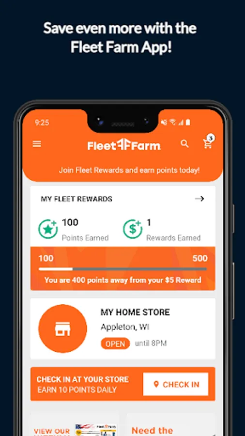 Earn 10 Rewards points daily, just by checking in at your local Fleet Farm store location.