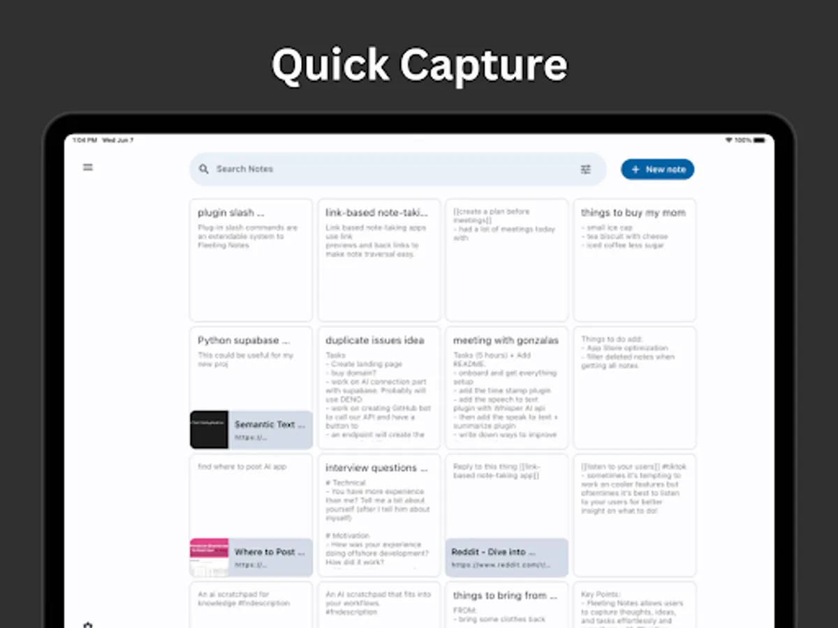Fleeting Notes is the ultimate solution for quick, efficient, and secure note-taking. Whether you're on your phone, tablet, or browsing the web, capture your thoughts in an instant, keep them organized and accessible, all while maintaining control over your data.