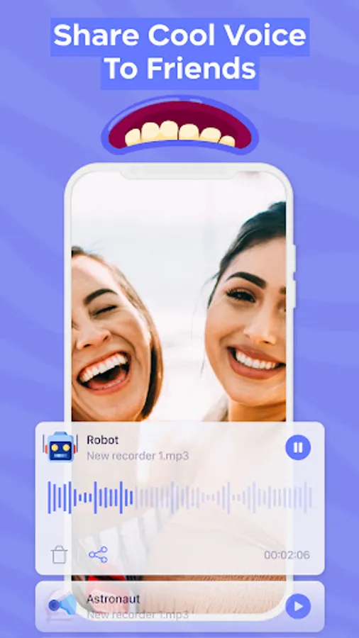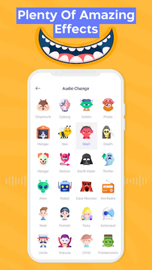 Voice Changer is a great voice changer with many unique sound effects. This app allows you to change your voice and audio files on your device into unique voices such as robot’s voice, Lolita’s voice, child’s voice, chipmunk’s voice, etc. All you need to do is open the Voice Changer application, record your voice or select one audio file available on your phone and start to create your own funny audio by many effects.
