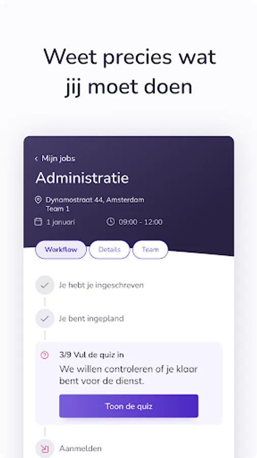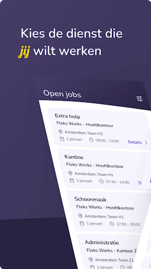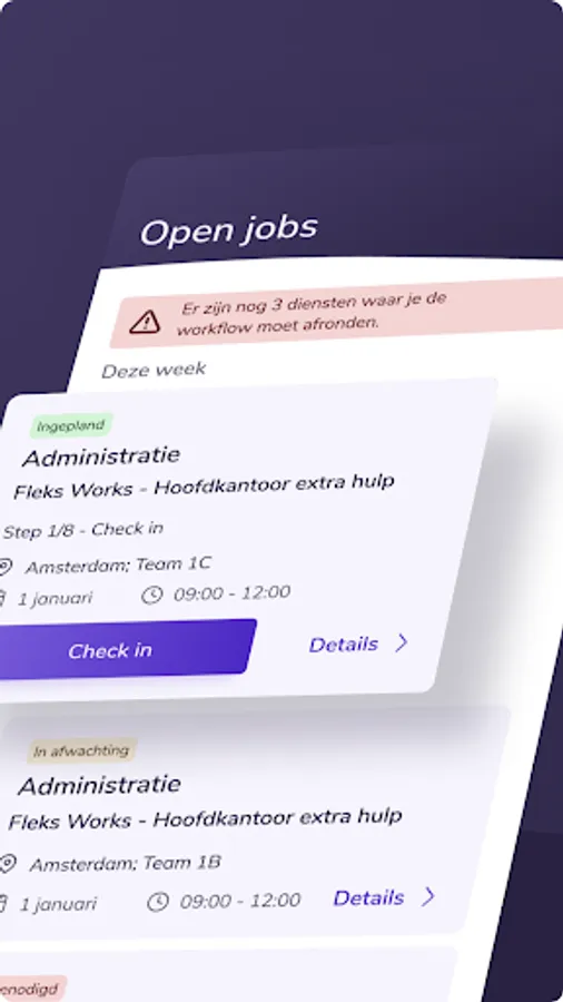 Fleks is a platform with which organizations can arrange everything for their flex workers in terms of availability, registration, planning and time registration. Through the app your flex workers are fully informed of their schedule, outstanding services and can immediately state their availability.