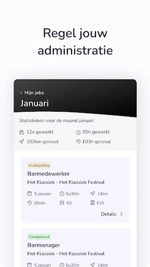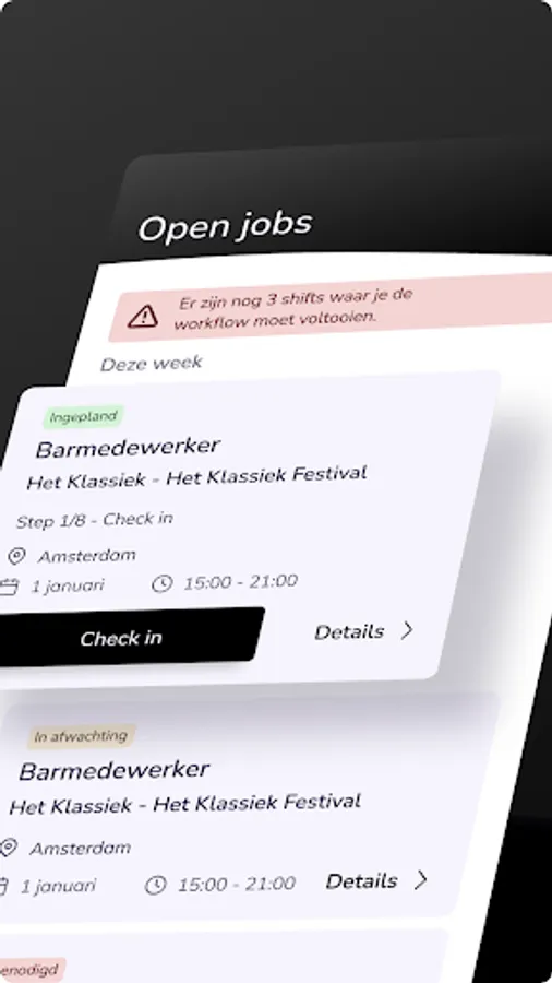 With the app from Het Klassiek you can view your freelance assignments, report your availability, respond immediately to open positions and receive all the important information and show day documents you need to get started prepared. Afterwards you can declare your travel and other expenses, pass on your hours and complete the evaluation. And all that easily and clearly in one app!