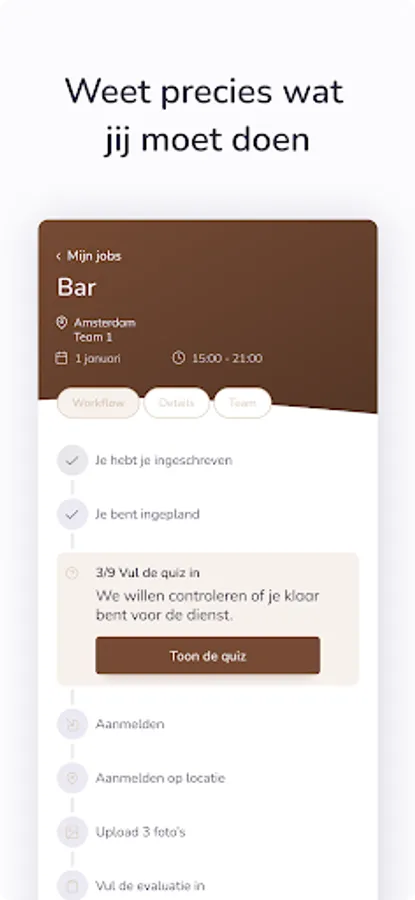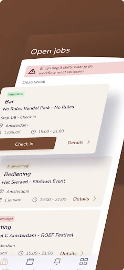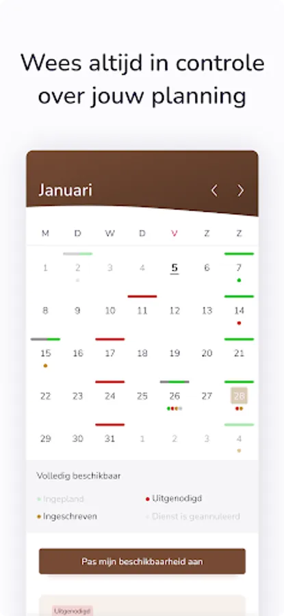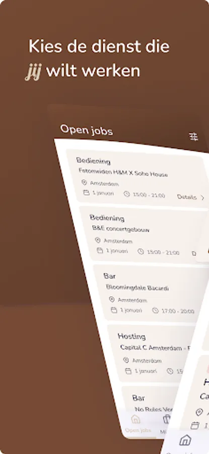 This way you can stay informed about all jobs, sign up for open services, fill in your availability and find your planned jobs, etc. All this easily and clearly in one app!