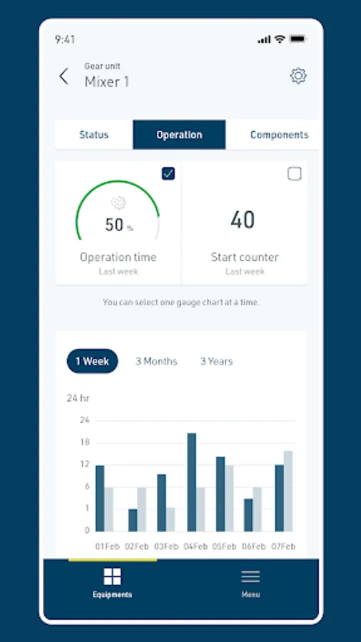 In local mode, the AIQ app will provide a dashboard, visualizing not only the health status of your asset, but also live data for commissioning and historical trend data of gear unit operation.