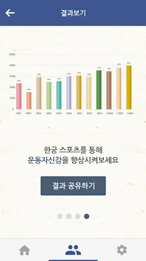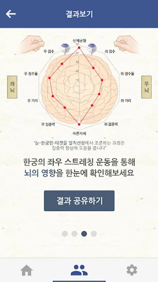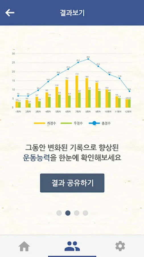 12주간 누적된 기록데이터를 통해 급수, 양손합계점수, 좌우점수차이, 양뇌발달상태, 운동자신감 변화량을 그래프 결과로 볼 수 있습니다.