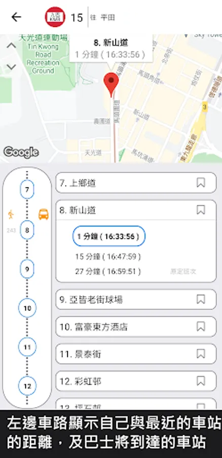Provide information such as the real-time arrival time of the bus and the nearest bus stop. You can bookmark bus stops to quickly browse information and browse the arrival time of all routes at the same station.