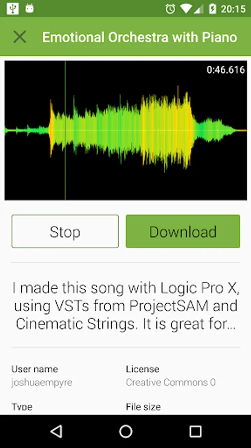 This app can be useful in your music production. Find great sound for your music track. Download sounds for your drum pad. To download sounds you should register account on http://freesound.org site.
