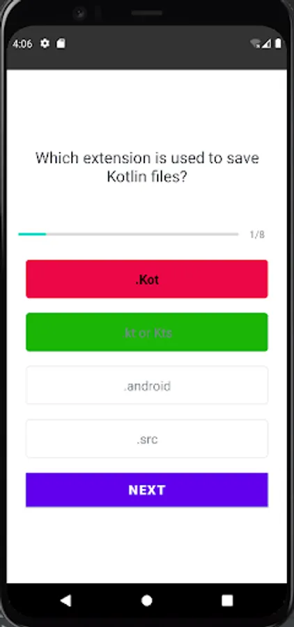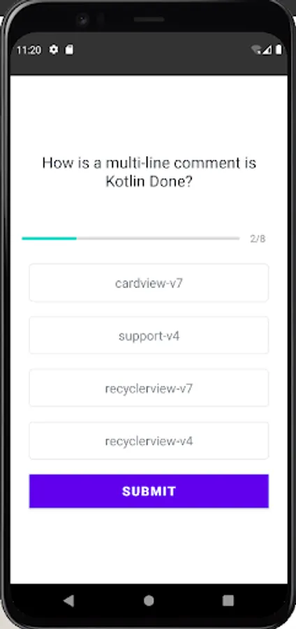This is Kotlin code quiz app that contains kotlin programming questions, to help you as a developer at any level of programming to sharpen and improve your skills. Most of these questions will also be asked in any kotlin job interview so they are a good practice questions.