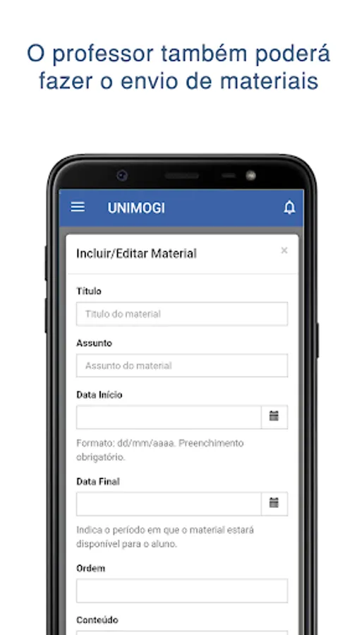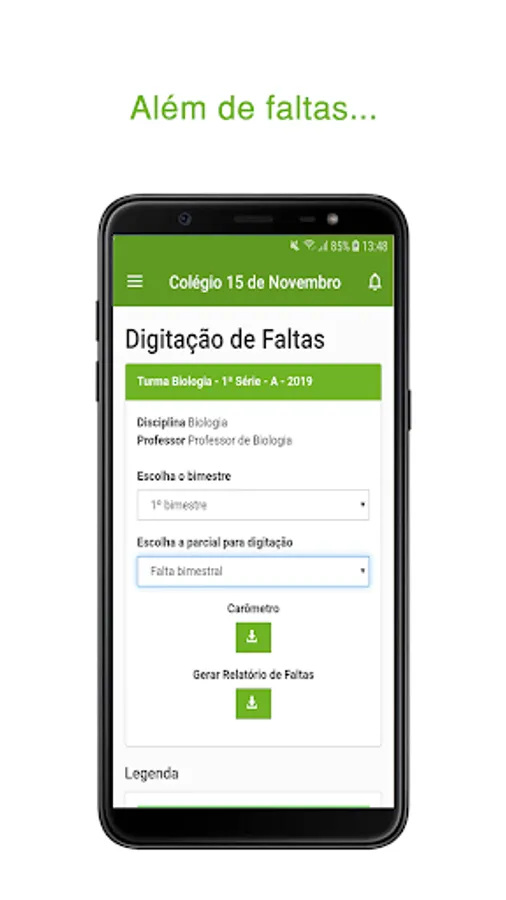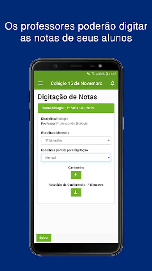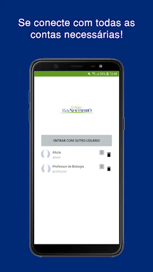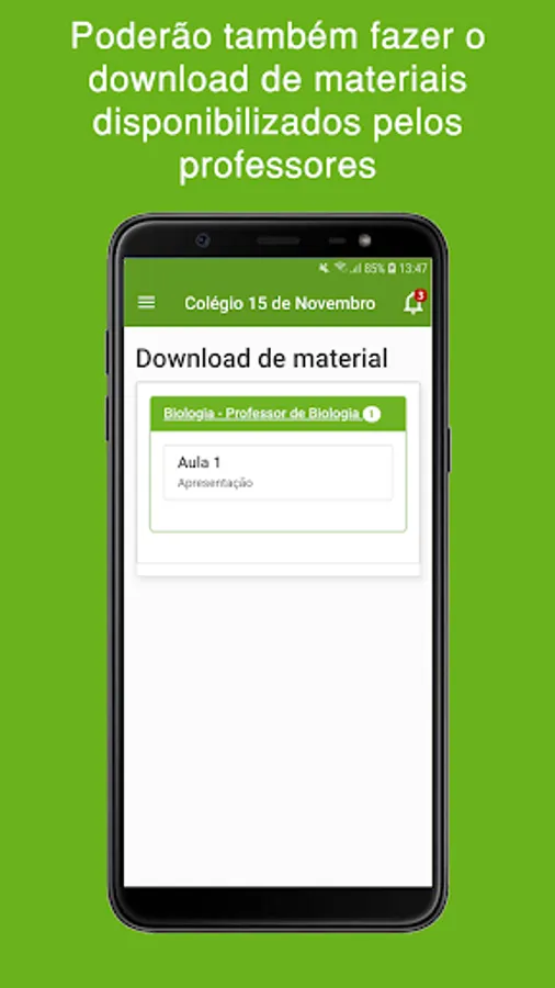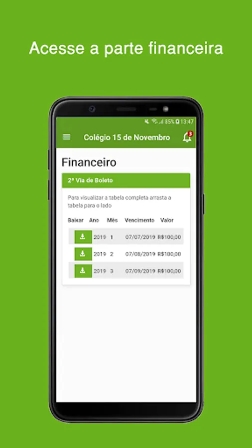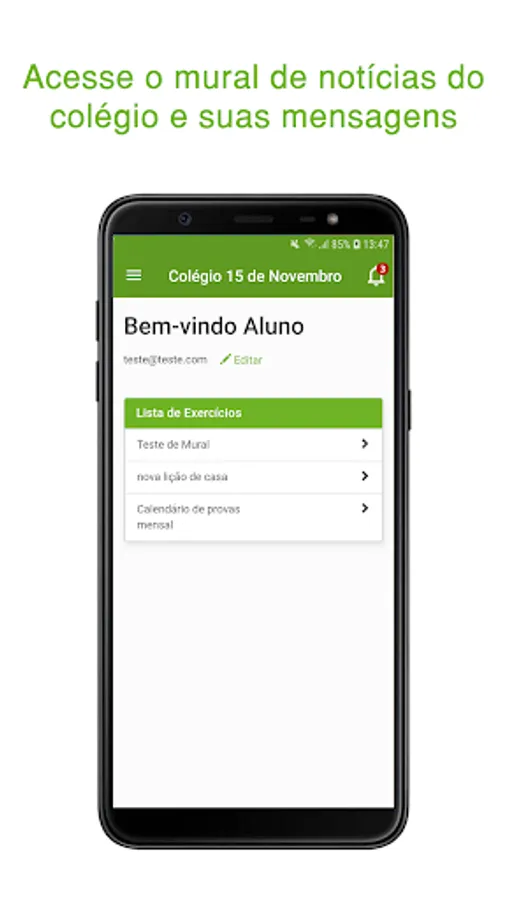 The student will be able to access his grades and absences, in addition to downloading materials made available by teachers, having access to his financial page and having access to the school's announcements and wall.