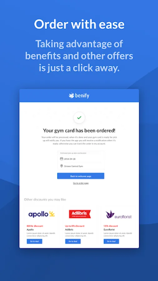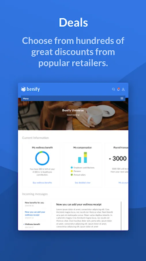 Through the Benify app, you can enjoy all your employee benefits at your fingertips. Connect with the latest rewards, benefits and everything else you enjoy through your employer. You can even browse and order your benefits directly in your mobile. Benify is the industry leader within employee benefits and rewards. We help thousands of employers worldwide to reward, engage and get closer to their employees.
