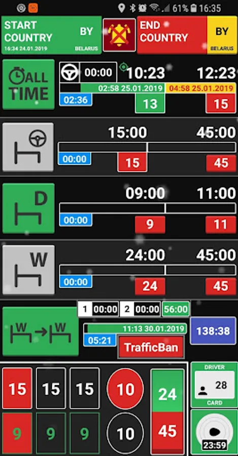Before starting work, turn on total work time timer of 13/15 hrs (ALL) and you will always know remaining work time. In 30 min before end (adjustable in options: 30, 45 or 60 min), the application will notify you by turning on screen and signaling on end of work day. If you exceed time limit, the application will show this exceeding in min.