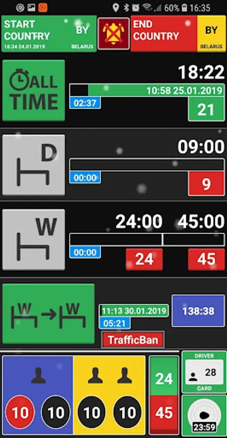 A timer of 144 hrs (W - W) is a very important timer. It must be turned on when you started your first work day, or when inter-week rest is over and a new work week begins. You will always see how much time is left before start of next inter-week rest. 144 hrs is maximum allowable time interval between two inter-week rests. Timer will notify you in 30 min (adjustable in options: 30, 45 or 60 min) about need to stay for another inter-week rest.