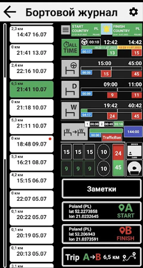 Third area is work calendar. If you traveled 15 or 9 hrs, then click on appropriate button. So you always see all the necessary information for the work week. If between two inter-week rests there were already three extended work days (15 hrs) or three short daily rests (9 hrs), then total work time timer (ALL) will only count to 13 hrs.