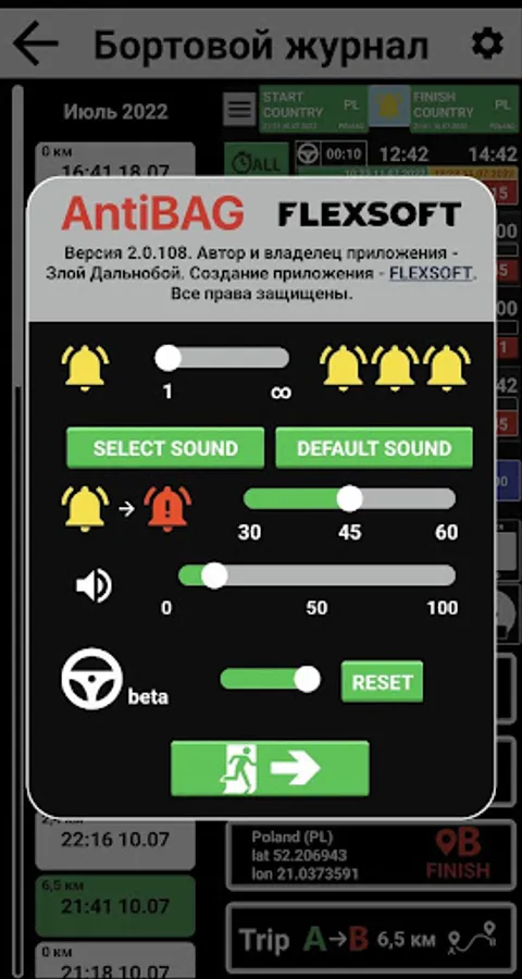 A timer of 45 min will inform you about rest when you are out of car or busy with your own affairs. Timer will give a signal at 15 and 45 min. What is more, the timer works according to tachograph rules. If rest has been pressed before 15 min, the rest does not count. If 15 min have passed and 45 min have not yet occurred, then only 15 min are counted, and next rest will be counted by timer as 30 min.