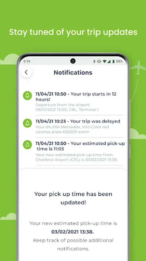 You have access to your trip information and ticket at any time via your phone and you will also get guidance you to your bus stop. Our app will allow you to receive important information, such as the exact position of your shuttle bus or Door2Gate van, delays or changes concerning the bus stop.