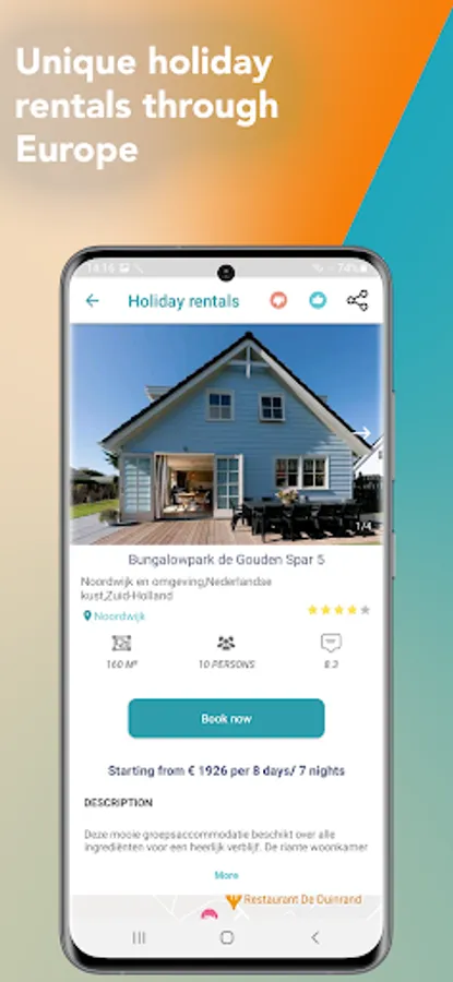 From now on you no longer arrange a holiday home behind the PC. Flickmyhouse offers you more than 2,772,000+ unique holiday homes in 21 countries throughout Europe. Easily book a holiday accommodation via your smartphone.
