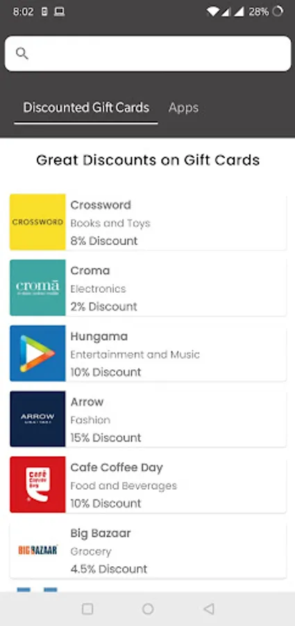 Discover Deals and Discounted Gift cards from Top Brands: Gift cards of leading retail stores or online merchants including Shoppers Stop, Lifestyle, Amazon.in, Flipkart, Uber, PVR Cinemas, Westside, Titan, BookMyShow, Cleartrip, Google Play, MakeMyTrip, BigBasket, Levi’s, Big Bazaar, Central, Croma, Lakme Salon, Dineout and many more.