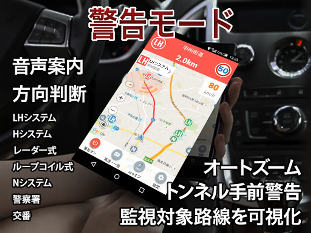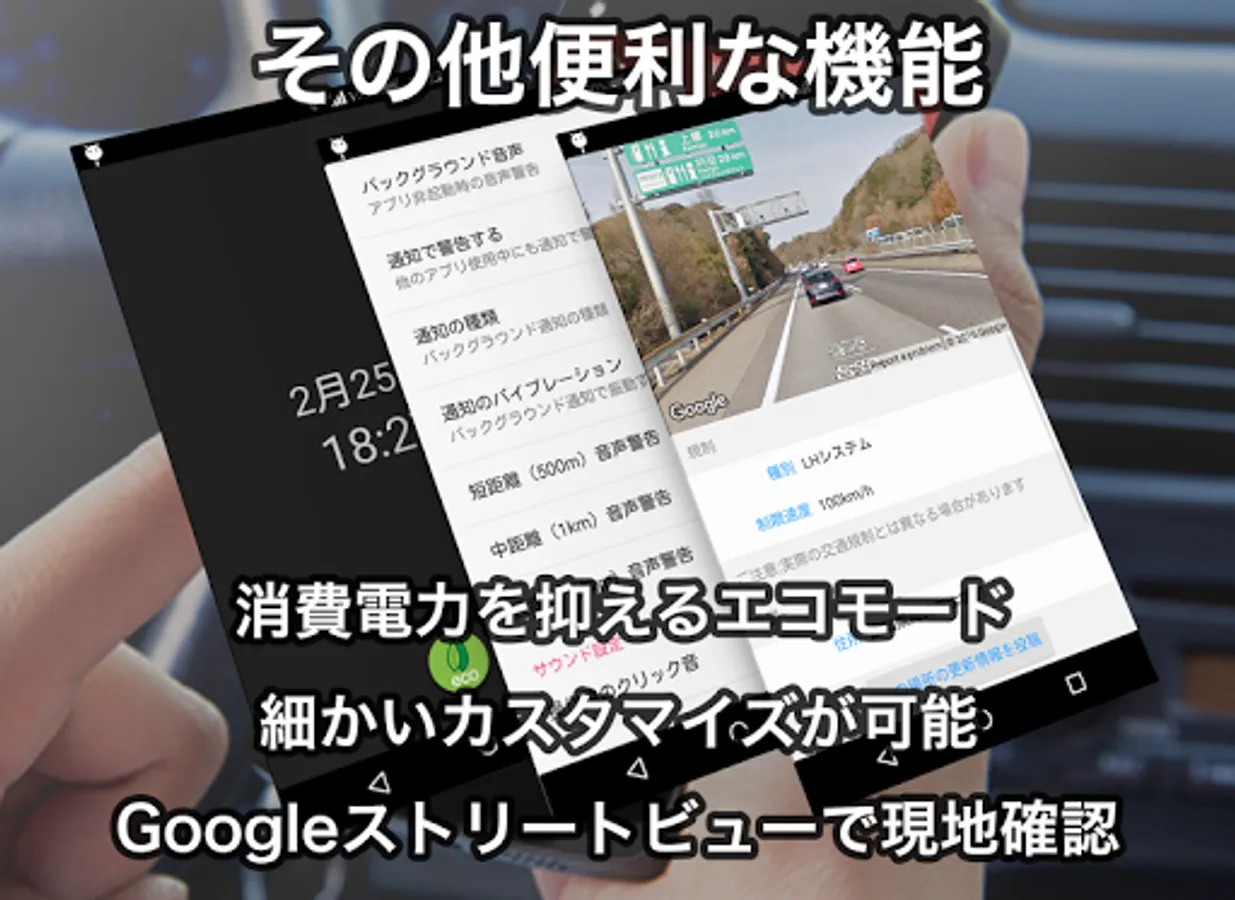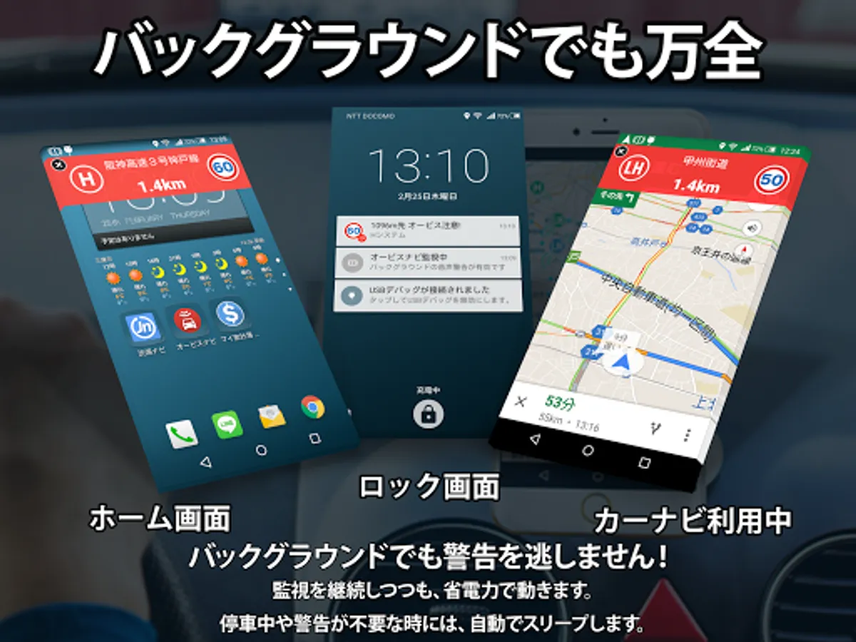 アプリを起動中はもちろん、バックグランド音声でもオービスを警告。他のカーナビや渋滞アプリとの併用も可能です。