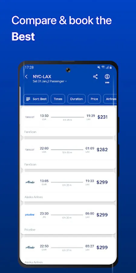 Our flight scanner app empowers you by delivering all the cheap flights available to your destination quickly. Get the best cheap airline tickets price at any time from anywhere, and get the best last minute flight deals.