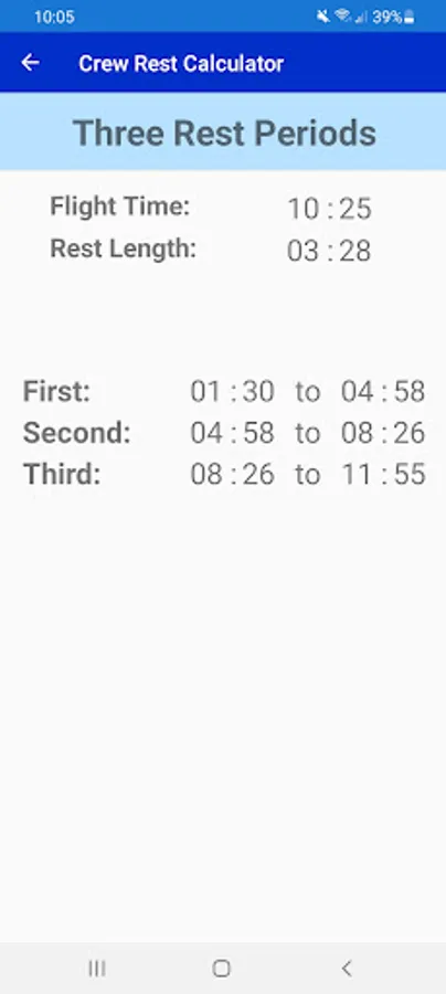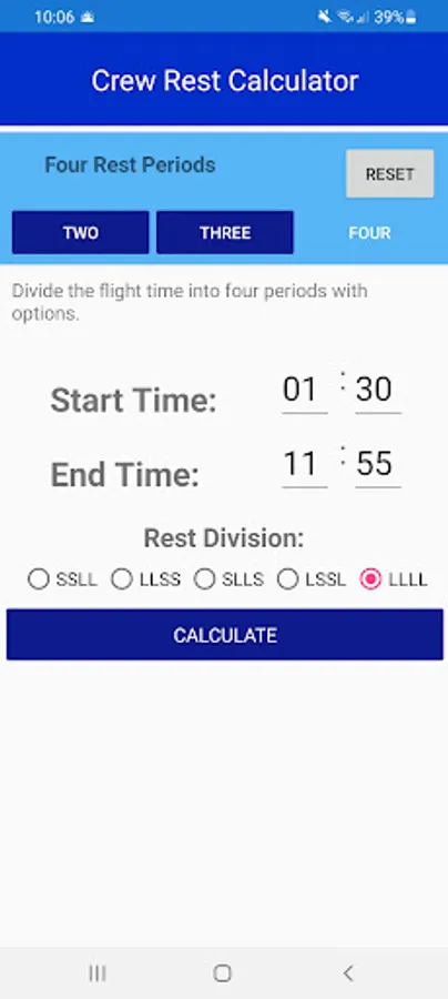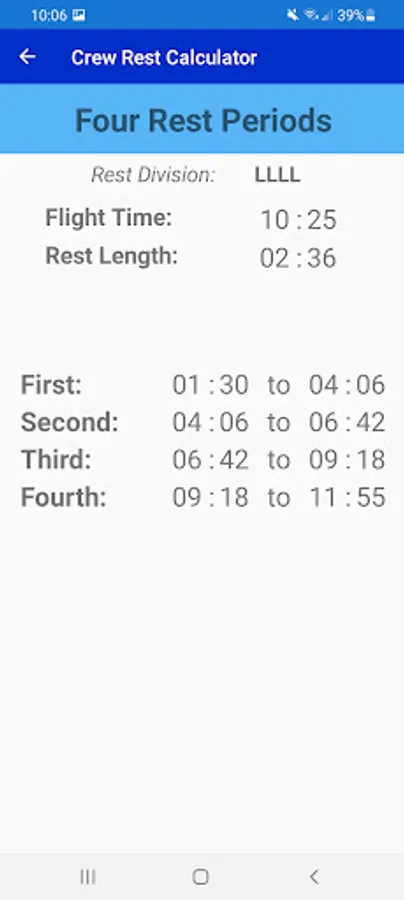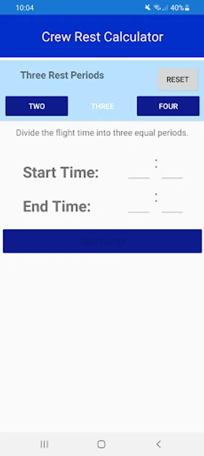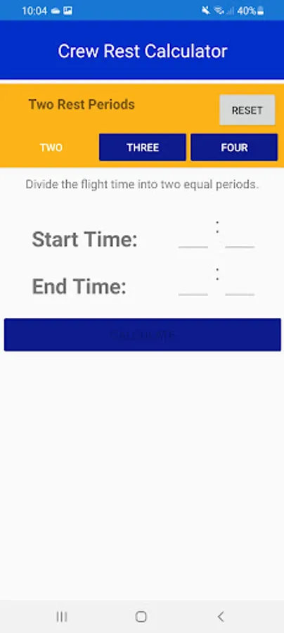 Crew Rest Calculator is an easy and fast way to divide crew rest timings into two, three or four divisions.