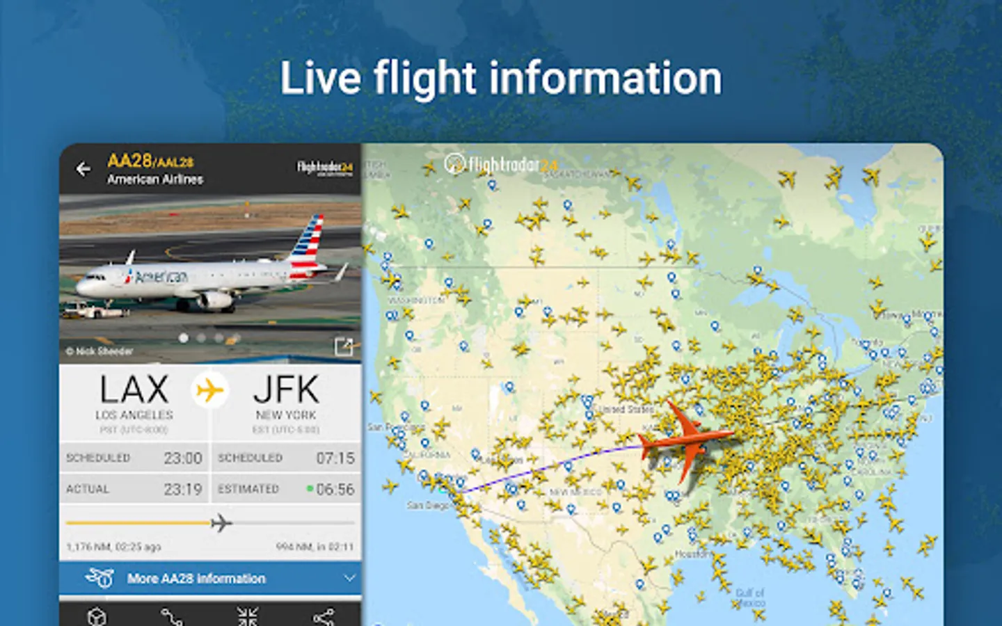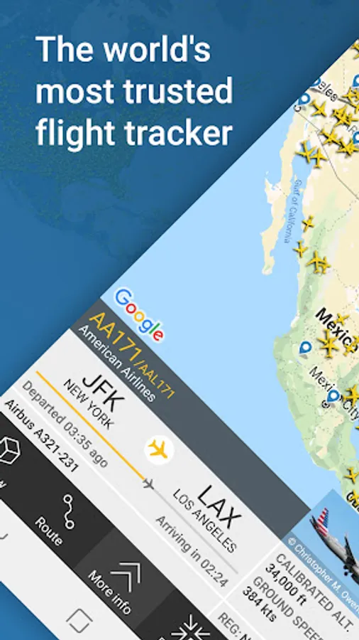 - Tap on a plane for flight details such as route, estimated time of arrival, actual time of departure, aircraft type, speed, altitude, high-resolution photos of the actual aircraft & more