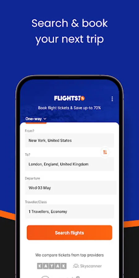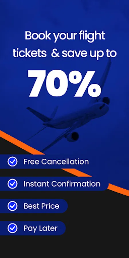 Cheap Flights・Flights70 app - provides all types of flight ticket bookings. Our flight booking app helps you search, compare prices and book cheap airline tickets from hundreds of flight booking agencies and websites. We have flight tickets for cheap flights booking, last minute flights booking, domestic, and international air tickets, cheap airlines tickets booking, etc. Compare deals from Kayak, Cheapoair, Skyscanner, Hopper, Skiplagged, Justfly, Kiwi, Travelzoo, Aviasales, Scotts cheap flights, Wayaway, Edreams, Momondo, etc. Get exclusive last minute flights deals with us and save your time and money!