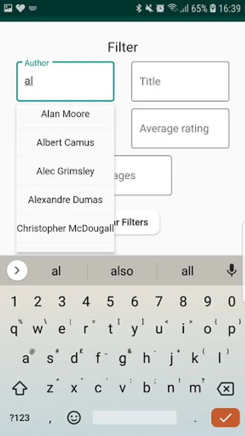 Filter books by: title, author, estimated days to read, average rating, and max number of pages.