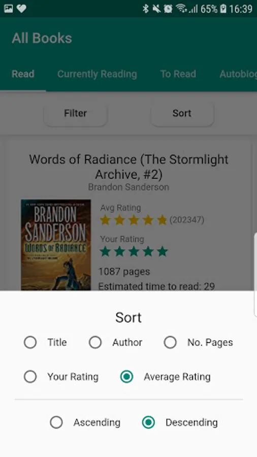 Sort books by: title, author, number of pages, average rating, or your rating.