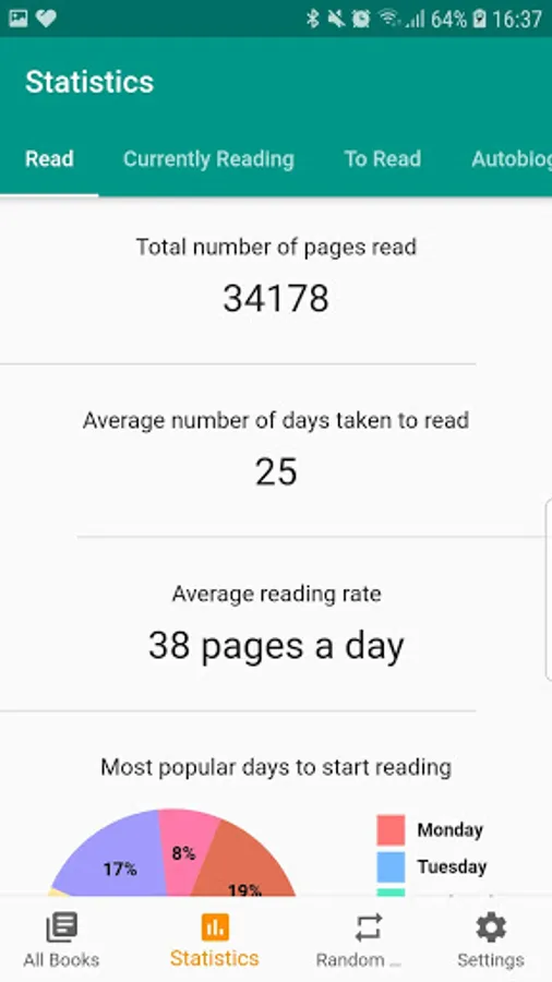 If you are a numbers nerd, there is also a page to get some fun statistics about your shelves, such as total number of pages read, your average reading rate, and your most popular days to start/finish reading a book!