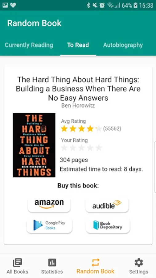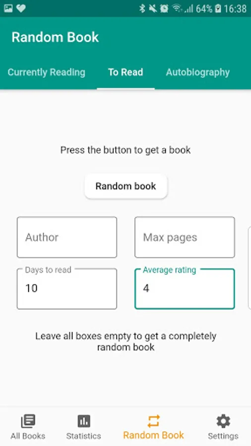 You can also get a random book from your shelves based on author, max pages, estimated days to read and average rating.