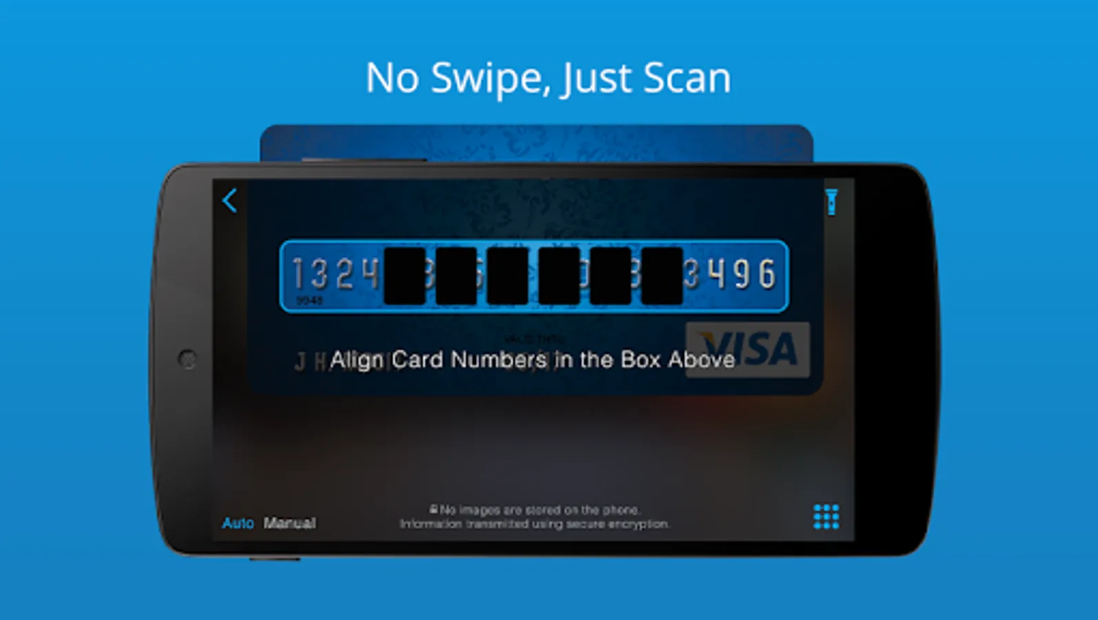 Flint DOES NOT take a photo of the entire card or save an image on the phone. Data is encrypted & protected in accordance with PCI DSS. Supports all major credit cards including VISA, MasterCard, American Express and Discover cards.