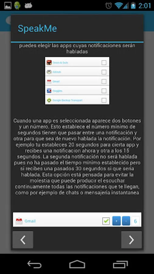 SpeakMe allows your phone to talk their notifications. But not all applications, only those that you want. Select them from the list and mark the minimum of seconds that must pass between notification of the same app to not be annoying. Ideal for times when you can not use the phone directly but you might find that it's happening on it. Listen who speaks in messaging apps like whatsapp or subject of an email are examples of the use of this app.