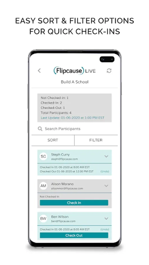 Access all of your Event Participants and Volunteers through the Flipcause app for one-click check-ins and check-outs. All check-in and check-out activity is timestamped and syncs in real time with your Flipcause event & volunteer campaigns and reports.