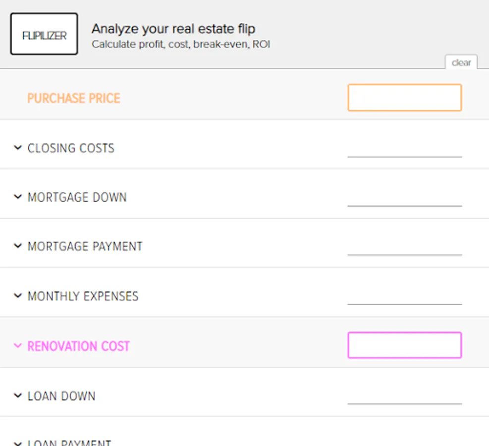 Flipilizer analyzes the financials of your property flip including break-even, ROI, profit, total cost, cash required and more. Provide the details you know and let Flipilizer do the rest. Defaults are intelligent but tweak as necessary.
