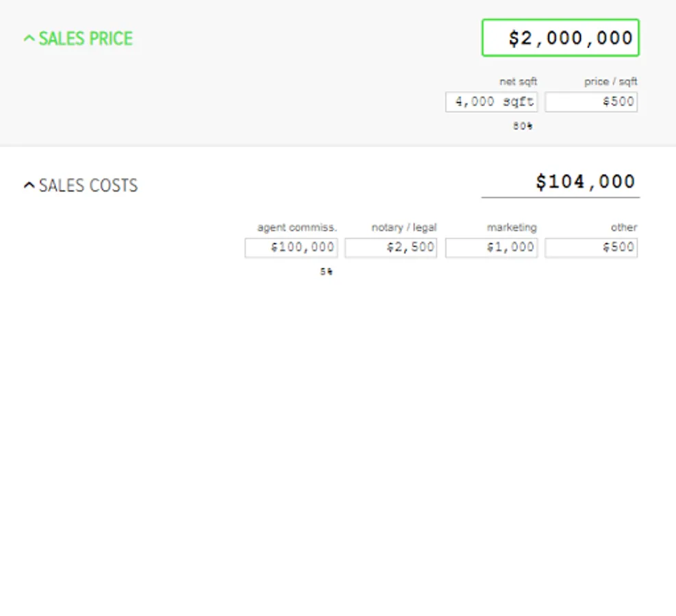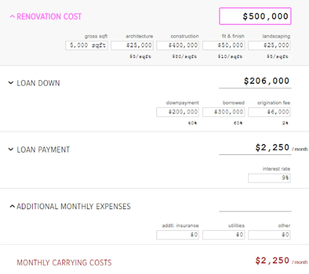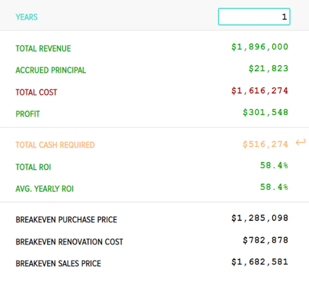 If you provide any two of Purchase Price, Renovation Cost, or Sales Price, Flipilizer will automatically calculate the break-even of the third. For example if you provide a Purchase Price of $1M and a Sales Price of $2M, Flipilizer will show that a Renovation Cost of around $780K (depending on your selections) would net zero profit. Every dollar saved below that break-even is a dollar earned. Let Flipilizer help you quickly and easily test different scenarios.