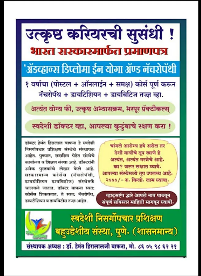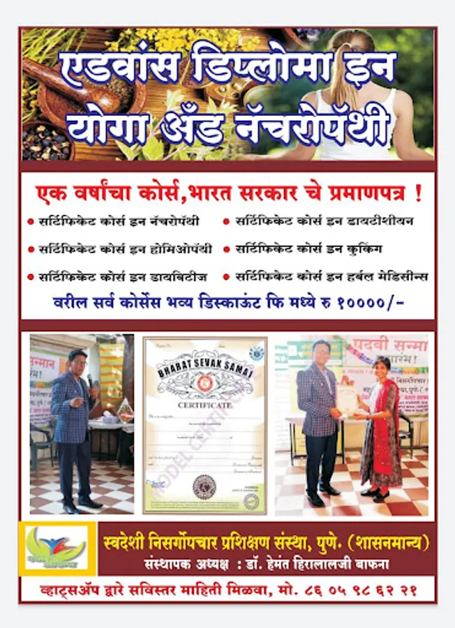 Science In the simplest way, the highest recreational training through smart mobiles in a very small fee! Notes and books will be available in Education Kit. Notes will be provided on mobile through Google Classroom. An indigenous ape has been arranged to see the precious lectures of Dr. Hemant Bafna. Marathi, Hindi, English medium can be selected. There is no age condition, it is necessary to pass the tenth pass. Get important dietary knowledge. Can be viewed on the Practical video. Protect Your Family From Conspiracy Discount offers are currently underway. Knowledge is the greatest strength. The training and guidance of a qualified training institute is needed to generate attractive income. Numerous expert congregations have joined. One thousand students take advantage of these courses every year. Doctor Hemant Bafna is self-guided. Getting great response. Take advantage of current offers. Deposit payment by bank, send payment details via WhatsApp. You will receive a call from our office and complete the admission process. The required documents are three photos, copy of Aadhar card, copy of certificate.