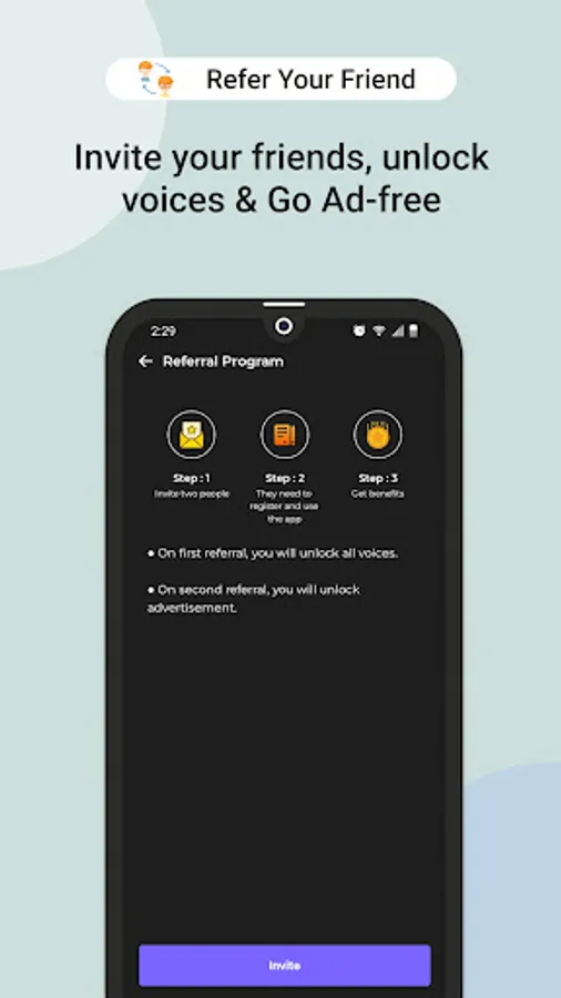 Referral - Refer this mobile app with your amazing friends to use all the listed voices with no ad disturbance.