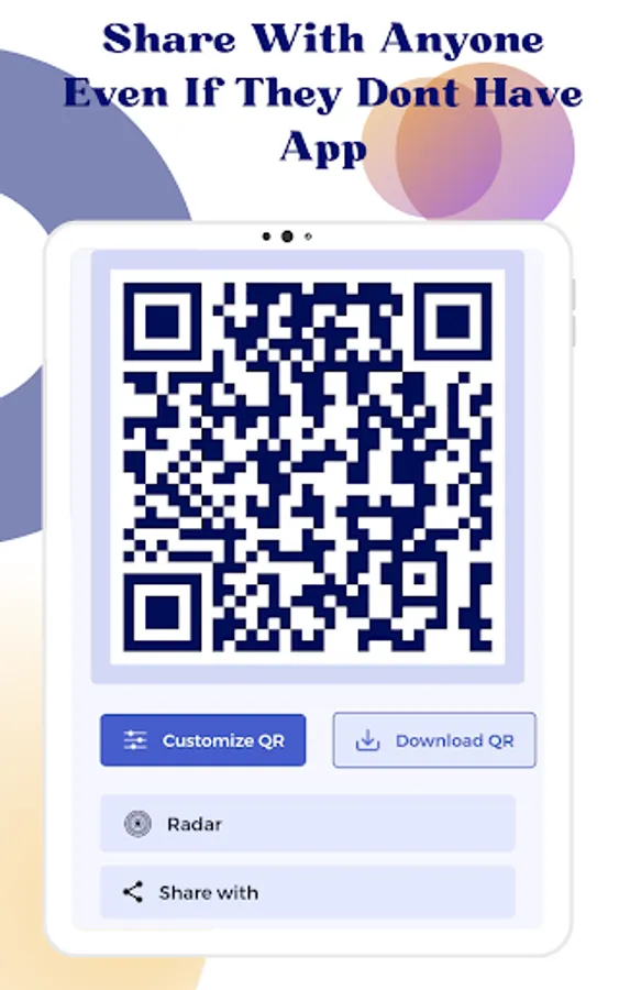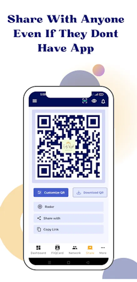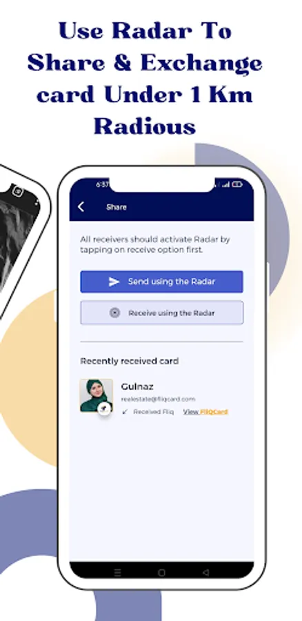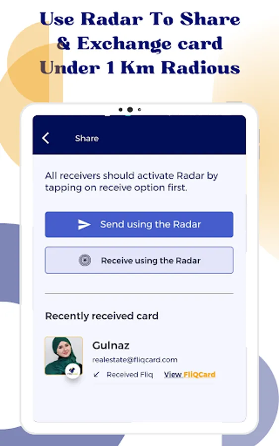 - Share your virtual card using your unique QR code, email, text message, Bluetooth, or a high-tech Radar under 1Km radio. With High tech, Radar shares your card at the same time with a group of people.